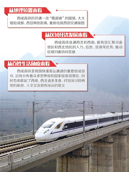 從地理位置來看,西成高鐵將一改“蜀道難”的困境,大大縮短成都、西安兩地距離,重新繪就西部交通版圖。從區域經濟發展來看,西成高鐵連通西北和西南,能有效匯聚川渝地區和西北地區的人力、信息、資源等優勢,推動區域均衡協同發展。從百姓生活角度來看,西成高鐵是我國快速客運通道的重要組成部分,沿線分布著眾多世界級和國家級旅游景區,對加深川陜兩地的旅游、人文交流具有深遠的意義。