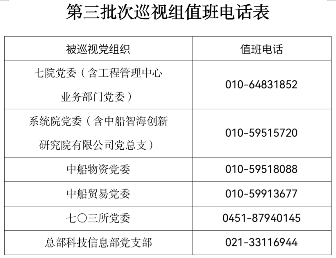 巡視期間,集團公司黨組巡視組設置值班電話和聯系信箱,主要受理反映被巡視黨組織領導班子及其成員、下一級黨組織領導班子主要負責人和重點崗位領導干部問題的來信、來電、來訪,重點關注違反政治紀律、組織紀律、廉潔紀律、群眾紀律、工作紀律、生活紀律以及巡視整改等方面問題反映。第三批次巡視受理信訪截止時間為9月22日。